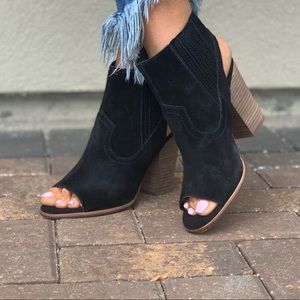 NIB Black Suede Peet Toe Open Back Ankle Bootie