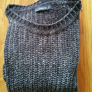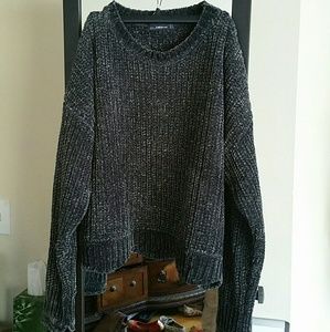 Greyish blue. Heavy. So so soft! So comfy. Slightly cropped. Crew neck. Slouchy. Wide sweater. Flowy. Loose. Has one flaw. There is a piece that's loose, it stays in mostly. I didn't notice it till I took the pictures. Maybe super glue can keep it in. Flaw shown in #6 & last picture. 25%off 2+items! :)