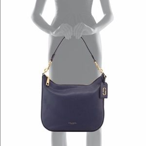 Color : Iris. A roomy hobo cut from luxe tumbled pebbled leather is topped with a racing-stripe web shoulder strap and finished with a dangling luggage tag. This MARC JACOBS hobo is coolly minimalist and perfect for everyday.