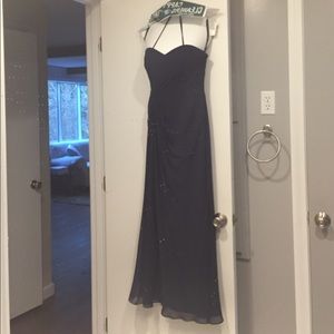 Navy Blue/ Size 8/ Altered to fit : 120 lbs, waist 25/26, bust 34 C, 5'5 with heels on. Beautiful dress. Stunning on. This dress has been dry cleaned and is ready to ship!