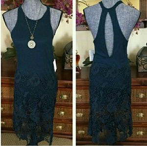 Free People Midi Dress in deep teal. This form fitting dress boasts a sleeveless, cutout back with a crochet panel at the hem, creating a feminine, flirty and oh so sexy midi silhouette!