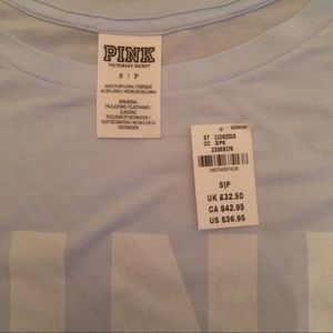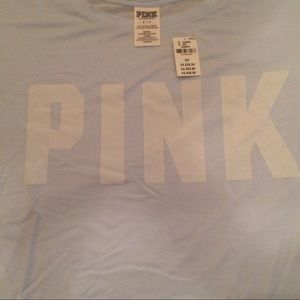 New with tags. Sheer long sleeve shirt with PINK logo on front. Oversized ,super soft. Can be worn off the shoulder, or will look cute tied on the side. 93% modal 7%elastane Color: Lt Blue with white Pink logo on front. •