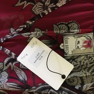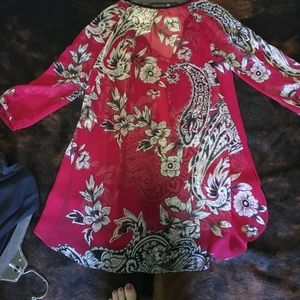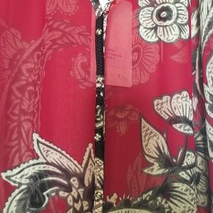 Yoana Baraschi long tunic blouse. Gorgeous red background with gray and black floral print. Perfect for spring. Never worn. Like new! 100% polyester.