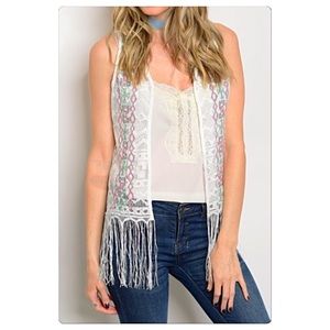 Be fun & flirty in this boho fringe lace vest with 4 clasp closure. Pair with sold tee, tank or cami or wear as bikini coverup. Super versatile & trendy. White with pink, blue & green tribal pattern. 100% Polyester. Looks great with denim jeans or shorts