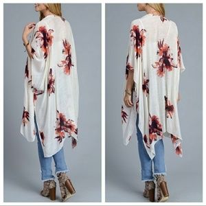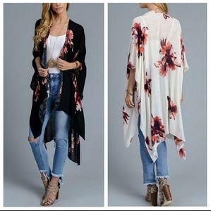Stunning ivory garden party kimono. Super soft 100% Viscose. 38"x46". Dress up or down. Also available in Black. While supplies last. Item not available for restocking.