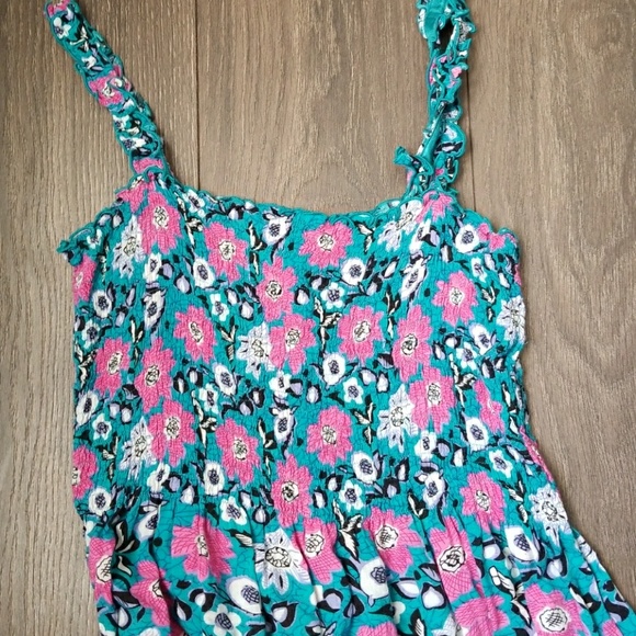 Teal and pink floral maxi dress with ruffled straps. 100% Rayon.