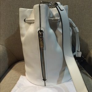 White color leather bucket bag. Pull string closure with detachable and adjustable strap. Silver metal logo in front. Height is 10.5 inches. Sorry Price is firm because of posh fee.