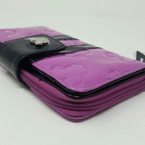 Disney Parks Original 100% Authentic lavender and black patent leather with Mickey and Minnie icons. This wallet features several credit card slots, ID slot, two zipper compartments, cash / receipts lots, and zipper pulls with Mickey details. Shows minor shelf wear.