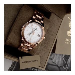 ✨Burberry 34mm Rose Gold-Plated 'The City' Watch✨Beautiful Stainless Steel 18K Ionic Rose-Gold Plated Watch And Band From The City Collection✨34mm round case✨18mm three-link bracelet strap✨Check-stamped silver dial with date window and rose golden time markers✨Quartz movement✨Sapphire crystal window✨Water resistant to 5 ATM {150 feet}✨Made in Switzerland✨Brand NEW With All Original Tags And Boxes Plus Instruction Book✨Simply Elegant And Trendy✨Please No Trades Or Lowballing✨PRICE FIRM✨