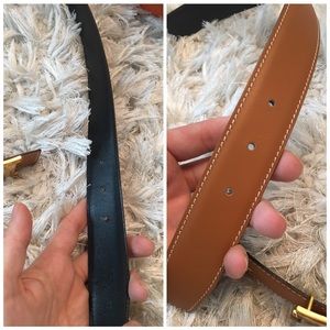 100% Authentic Hermes Constance Reversible Belt Kit. Featuring signature polished gold H Buckle, smooth tan leather with contrasting stitching and black leather Reversible strap. This belt is in new condition, still has the plastic covering the H Buckle!!! It is stunning to add to your collection. Stamped size 75. Measures approx 1.2" in width and 28.3" - 30.3" in length. Comes with box, dustbag and ribbon!
