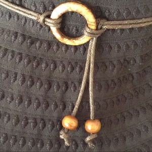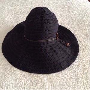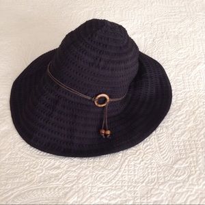 Easy to wear and ready to travel navy blue sun or rain hat. Polyester light weight hat that can be washed in cold water. I like it because the hat can be packed or kept in your car for sunny days. There is a two cord brown band with a ring and hanging beads. The texture is great, check out the close photo. Definitely navy blue. . . Not Old Navy. Comes from a smoke free home and is really to hike.
