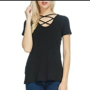 Beautiful Black Crisscross Scoop Neck Top. Great for any occasion, everyday wear. Easily dressed up or casual. Very attractive and flattering. Stretchy material.
