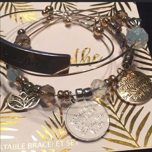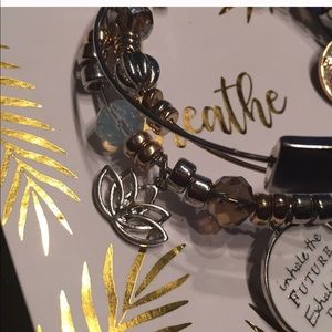 The necklace has a faux leather choker with stone and tassel tiers. 3 adjustable charm bracelets with motivational sayings. They’re not a set. But still you can wear. It’s not 30% off. Smoke and pet free house.