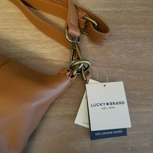 100% Genuine brown leather bag by Lucky Brand. Single top handle with Detachable adjustable crossbody strap. Zip top closure. Exterior: stitching and tassel details, 1 front slip pocket with magnetic closure and 1 back zip pocket. Interior: 1 zip wall pocket and 2 slip pockets. Size: 11" H x 14.5" W x 5" D