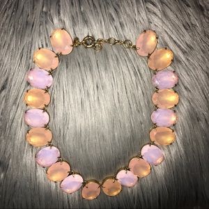 This necklace has slightly different gems that reflect different shades of pink in the light. Has been worn only a few times, and is comfortable to wear.