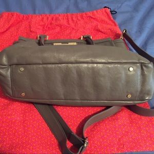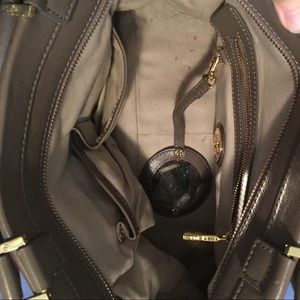 Grey leather with gold accents. Comes with cross body strap and mirror on the inside. No major scratches. Just normal wear and tear. Some wear on handle. Can take more pics when requested. 14 inches wide, 10 inches high about 3 inches deep. Prices negotiable *NO TRADES*