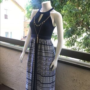 A elegant classy woman mod look for your next social get-together. A sleeveless maxi dress with a solid knit top featuring a keyhole neck. Print woven skirt adds to the look. Hidden back zipper. Lined to the knee.