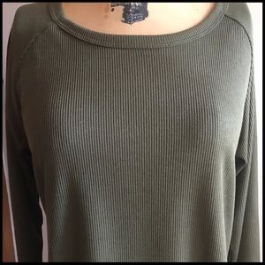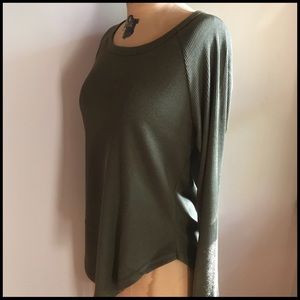 Low-Back Strappy Top; low cowl-style back; strap detail on back; ribbed material; Tunic length in from and back with shorter sides; cotton/poly blend; Please examine all pictures prior to purchasing. @A1
