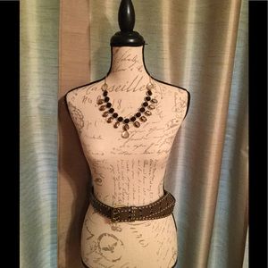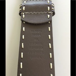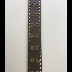 NWOT item. Never worn. Unisex style grommet stitched double hole leather brown belt. High quality bonded leather. 1 1/2" wide, 47" long. Last holes are at 46". Holes 1 1/4" apart. 1st holes 6 1/2" from buckle. 2 rows of grommets running the entire length of belt creates an eye catching appeal. Brass buckle & rivets. Single loop. Decorative cream stitching highlights the color of the leather. Thick heavy weight which is durable & long lasting. NECKLACE AVAILABLE IN SEPARATE LISTING.