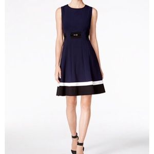 Chic Calvin Klein fit and flare color block dress with flattering belt at waistline and striped hem. Great for Easter, business, or your next party! -lined, dry clean, zipper in back. Navy blue with black stripe
