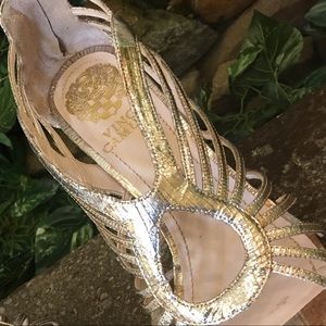 Pinkish gold or Champagne color 4 inch heels with a zipper in the back. Unfourtrinally my father has a old furnace and my heel went through the grid shown in the picture.