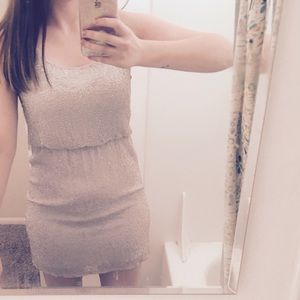 Silver Embellished/ Sequined authentic Alice+Olivia party dress. Very flattering it billows bellow the chest and is very comfortable because it's lined so that you don't feel all the pretty beading. Worn once for Valentine's Day. It can be dressed down with booties and a leather jacket but defiantly looks cuter with heals. Perfect for date night, summer weddings, NYE and is a great designer dress to have in your party wardrobe.