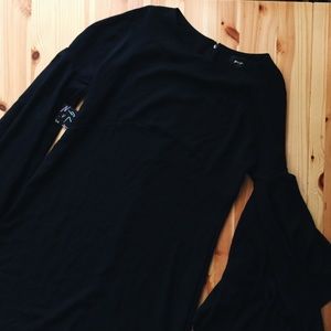 Made in black crepe and has a shift silhouette with sculpted empire waist. Features ultra wide cascading bell sleeves and scoop neck. Hook and zipper back closure. 95% polyester, 5% spandex. Unlined. Made in USA. Model photos credit to Nasty Gal.