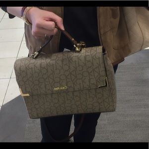 New Calvin Klein Hudson Handbag, stylish good color-brown taupe appearance. Great texture, quality genuine materials. Straps brown color. Body is beige tan with CK pattern back and front. Slip pockets and zipper pocket interior. Shoulder strap adjustable. Two magnetic snap closure under front flap.