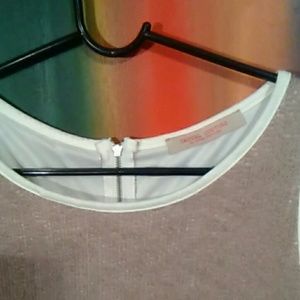Light brown and ivory peplum top. Sleeveless, scoop collar, silver zipper closure @ back of neck. High low peplum. Tan portion of top is knit. Great condition, no stains or pulls. Size Small, 74% polyester, 23% Rayon & 3% Spandex , Made in USA.