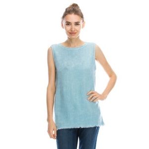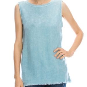 This top is one of a kind! The quality and design is amazing. Mineral wash, raw edges, chic back design. Not sheer. Style tucked in or out with shorts or Skinnies. Front length 24", back length 26". Chest 17" in size small. Each size 1" difference. Linen/cotton/rayon. Worn with my white Skinnies also for sale. For sizing reference Im wearing a size large. I'm 5'4", 150lbs, 36C