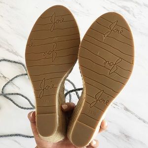 Joie | 'Phyllis' wedge espadrille sandals in Denim. These feminine sandals feature wraparound braided ankle ties, denim upper, and peep toe. Braided jute platform wedge. Slight pink marks on side of shoe as shown in 3rd photo (barely visible). In excellent, like new condition. Dust bag/box not included. This shoe is a size 8 1/2, but these run small/narrow and would be best for a size 8.