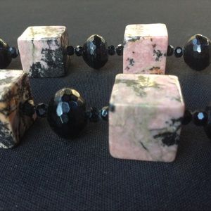Striking necklace of pink, black & gray rhodochrosite cubes alternating with jet black glass /crystal beads. Nice juxtaposition of shape and texture. The soft flowing marbling in the square stones really stands out because they are separated by the round black beads. The facets on the beads add a great shimmer to this piece. I love the unique shape of the rhodochrosite, it is rare to see it cubed like this. Cubes are 5/8". Necklace is 19" long. 197g. Purchased at a gem show a few years ago.