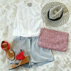 Handkerchief embroidered cotton voile. Mandarin collar. Button closures top; zipper & button closure shorts. Slightly loose fit. High-rise, slight distressed 5-pockets shorts. 100% cotton. Color: white top & light washed denim.