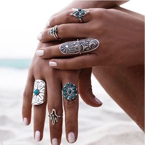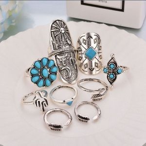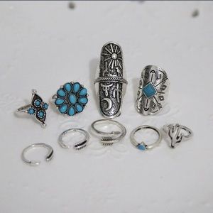 Gorgeous 9-piece silver vintage midi ring set with turquoise accents.