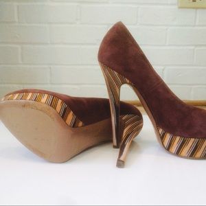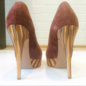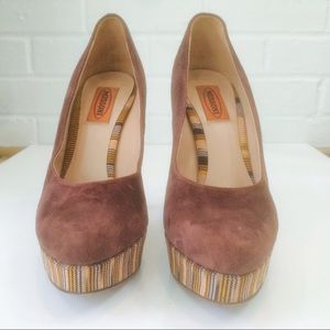 Missoni Suede and contrasted fabric heel and platform. Rounded toe, soft leather and fabric insole, leather sole. Deep, rich purple suede upper with multicolored signature Missoni fabric. 4" heel. Barely worn, purchased at Saks Fifth Avenue.