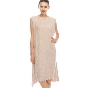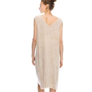 The quality and design is amazing. Natural color mineral wash, raw edges, chic back design, midi length. Not sheer. Style loose or add a belt (not included), with sandals or any style booties. 35% linen 35% rayon 30% cotton. For sizing reference I'm wearing a medium. I'm 5'4" 150lbs, 36C