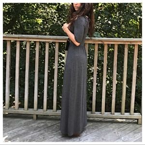 Grey side pocket 3/4 sleeves maxi dress in a viscose jersey spandex knit Bust measurements laying flat on one side S 16 M 17 L 18 XL 20 length S 58 M 59 L 60