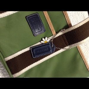 Coach small olive green tote with blue, brown, and white trimming with silver hardware. Front has a small pocket and says coach. Hangtag has a daisy keychain. Zip closure with white interior with the "c" jacquard pattern in green and one sip pocket. Authentic as shown by creed patch and Hangtags. Has one small spot on the front next to the brown stripe, no other wear/tear. Measures 11x6x3 with a 4" strap drop.