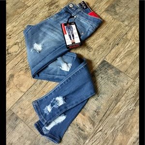CLEARANCE ENJEAN destructed skinny jeans. Perfectly distressed with rips & tears. vintage wash, ankle, stretchy. 58%cotton 18%Rayon 22%polyester 2%Spandex