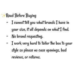 @monicasharp comment ur measurements and purchase your size and then tell me what your type of style is and i will fill the box with what i have based on your style :)
