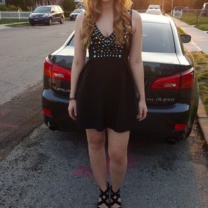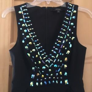 Beautiful black dress by Guess. Blue and green mermaid-like gems all over top area, no other place on dress. No missing gems! Dress only worn once for a birthday. Not too short or too busty- perfect for any occasion! And so comfy to wear! Zipper closure in back.