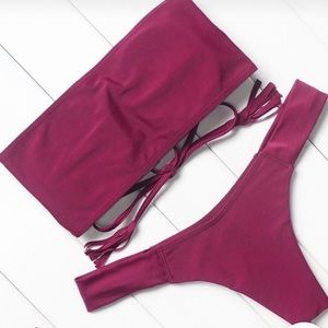 Sexy burgundy maroon bandage bandeau strapless tie up bikini set. Cheeky and Brazilian. Sizes small and medium and large in stock. Runs slightly small. Light removable pads. Lined. Never been worn. Also available in light purple mauve and light baby blue. Marked acacia swimwear Frankie's bikinis nasty gal misguided beach bunny for visibility, but it's from a boutique. Received 5 star ⭐️ reviews! 💕✨ RECEIVE A FREE CHOKER NECKLACE FT. IN THE LAST IMAGE WITH A FULL-PRICE PURCHASE OF THIS ITEM ✨💕