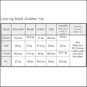 Lightweight semi-sheer sweater-like knit material with an open-back lace up detail. Has a mock turtleneck. Runs small, sizing up is advisable.