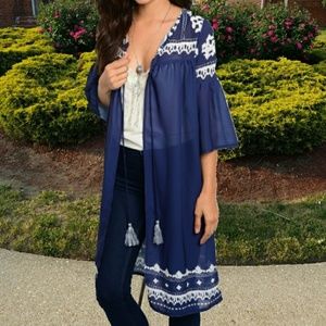 Chic babe alert! This navy longlined chiffon cardigan has got us like OMG. It has an ivory/white print. Ruffled 3/4 sleeves. Tasseled ties. Semi sheer. Total boho babe must have! Fits TTS.