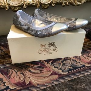 COACH SOFT LEATHER BALLERINA FLATS WITH SILVER SEQUINS!! WORN ONCE. COMES IN ORIGINAL COACH BOX. (SEE PICTURE #6 SHOWS SLIGHT DARKER AREA ON FABRIC. NOT NOTICEABLE-IT FACES INNER SIDE)