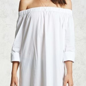 🚫🅿🅿🚫NO TRADES‼️Off the shoulder white dress, cuff sleeve, elastic around shoulder/neckline makes it comfortable. Loose fit, can belt it or where as shown. Polyester, worn once but in excellent condition. Great for summer. Fits true to size. Women's size.