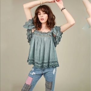 Washed and faded black/Gray square neck top with Crochet trim detail. Sizes S(0-4) M(6-10) L(12-16) 100% cotton.