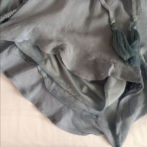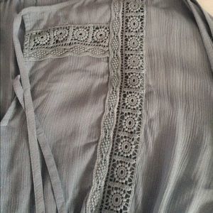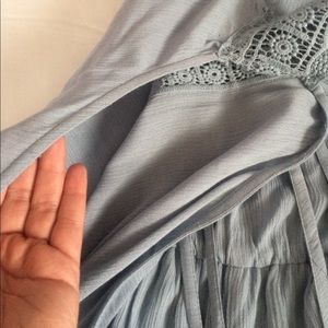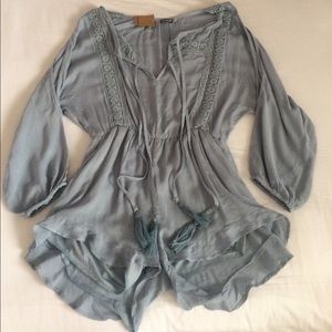 Super cute, cold shoulder sleeved romper with amazing detailing. The bottom half is lined, so it's not see through. I had a hard time trying to get an accurate picture of the color but it's more of a dusty blue. Perfect for festival season! NWT (purchased at a boutique in SC). Size M. Smoke FREE home as always! 💕
