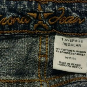 Medium denim color with light wash factory fading. I cut the bottoms off but did not want them hemmed. I like the distressed look. Two pockets and coin pouch in the front. Two pockets in the back with threaded design. From a pet and smoke free home. SIZE 1 Regular MEASUREMENTS approx: Waist 26 inches, Inseam 29 inches, Ankle Opening 8 inches My mirror is scratched sorry, there is no white paint stain on pants!