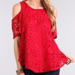 Lace cold shoulder top round neckline & rounded high low hem.